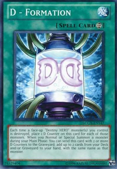 Each time a face-up ‘Destiny HERO’ monster(s) you control is destroyed, place 1 D Counter on this card for each of those monsters. When you Normal or Special Summon a monster during your Main Phase: You can send this card with 2 or more D Counters to the Graveyard; add up to 2 cards from your Deck and/or Graveyard to your hand, with the same name as that monster.