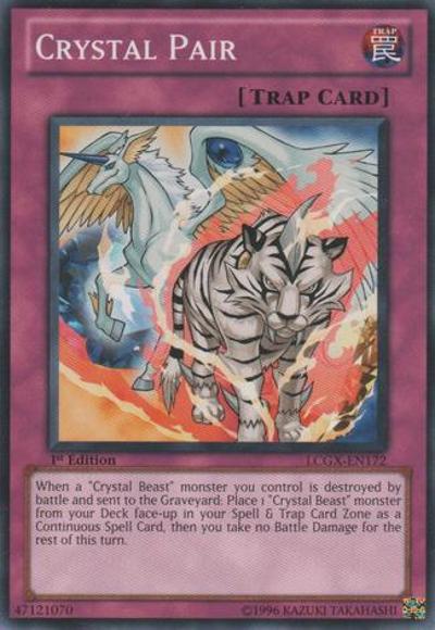 When a ‘Crystal Beast’ monster you control is destroyed by battle and sent to the Graveyard: Place 1 ‘Crystal Beast’ monster from your Deck face-up in your Spell & Trap Card Zone as a Continuous Spell Card, then you take no Battle Damage for the rest of this turn.