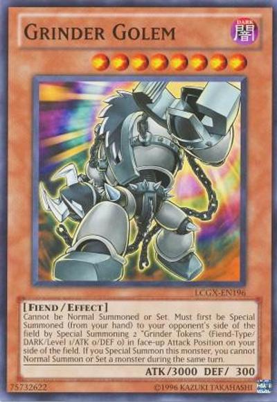 Cannot be Normal Summoned or Set. Must first be Special Summoned (from your hand) to your opponent’s side of the field by Special Summoning 2 ‘Grinder Tokens’ (Fiend-Type/DARK/Level 1/ATK 0/DEF 0) in face-up Attack Position on your side of the field. If you Special Summon this monster, you cannot Normal Summon or Set a monster during the same turn.