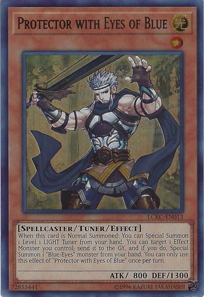When this card is Normal Summoned: You can Special Summon 1 Level 1 LIGHT Tuner from your hand. You can target 1 Effect Monster you control; send it to the GY, and if you do, Special Summon 1 ‘Blue-Eyes’ monster from your hand. You can only use this effect of ‘Protector with Eyes of Blue’ once per turn.