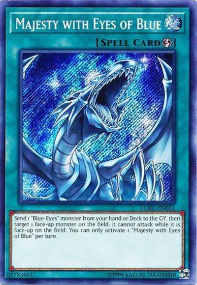 Send 1 ‘Blue-Eyes’ monster from your hand or Deck to the GY, then target 1 face-up monster on the field; it cannot attack while it is face-up on the field. You can only activate 1 ‘Majesty with Eyes of Blue’ per turn.