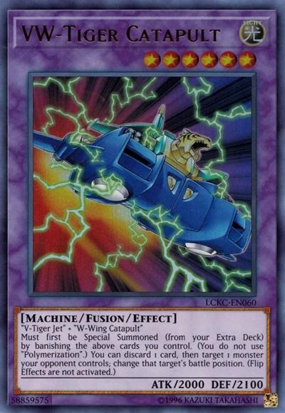 ‘V-Tiger Jet’ + ‘W-Wing Catapult’Must first be Special Summoned (from your Extra Deck) by banishing the above cards you control. (You do not use ‘Polymerization’.) You can discard 1 card, then target 1 monster your opponent controls; change that target’s battle position. (Flip Effects are not activated.)