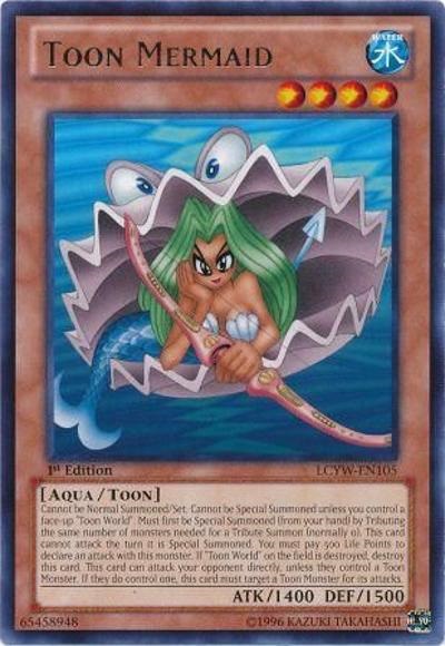 Cannot be Normal Summoned/Set. Cannot be Special Summoned unless you control a face-up ‘Toon World’. Must first be Special Summoned (from your hand) by Tributing the same number of monsters needed for a Tribute Summon (normally 0). Cannot attack the turn it is Special Summoned. You must pay 500 LP to declare an attack with this monster. If ‘Toon World’ on the field is destroyed, destroy this card. This card can attack your opponent directly, unless they control a Toon monster. If they do control one, this card must target a Toon monster for its attacks.