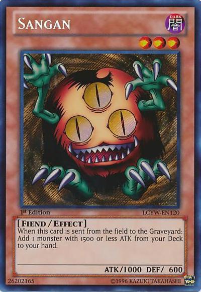 If this card is sent from the field to the GY: Add 1 monster with 1500 or less ATK from your Deck to your hand, but you cannot activate cards, or the effects of cards, with that name for the rest of this turn. You can only use this effect of ‘Sangan’ once per turn.