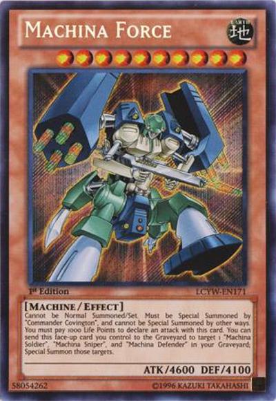 Cannot be Normal Summoned/Set. Must be Special Summoned by ‘Commander Covington’, and cannot be Special Summoned by other ways. You must pay 1000 Life Points to declare an attack with this card. You can send this face-up card you control to the Graveyard to target 1 ‘Machina Soldier’, ‘Machina Sniper’, and ‘Machina Defender’ in your Graveyard; Special Summon those targets.
