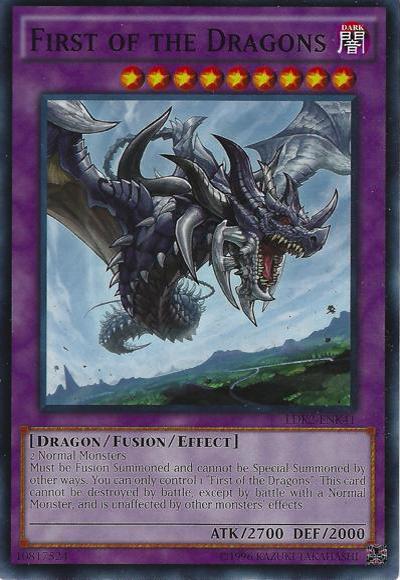 2 Normal MonstersMust be Fusion Summoned and cannot be Special Summoned by other ways. You can only control 1 ‘First of the Dragons’. This card cannot be destroyed by battle, except by battle with a Normal Monster, and is unaffected by other monsters’ effects.