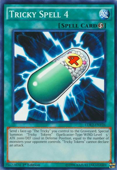 Send 1 face-up ‘The Tricky’ you control to the Graveyard; Special Summon ‘Tricky Tokens’ (Spellcaster-Type/WIND/Level 5/ATK 2000/DEF 1200) in Defense Position, equal to the number of monsters your opponent controls. ‘Tricky Tokens’ cannot declare an attack.