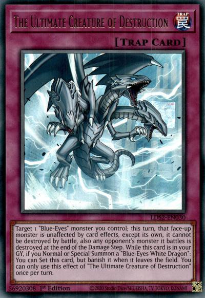Target 1 ‘Blue-Eyes’ monster you control; this turn, that face-up monster is unaffected by card effects, except its own, it cannot be destroyed by battle, also any opponent’s monster it battles is destroyed at the end of the Damage Step. While this card is in your GY, if you Normal or Special Summon a ‘Blue-Eyes White Dragon’: You can Set this card, but banish it when it leaves the field. You can only use this effect of ‘The Ultimate Creature of Destruction’ once per turn.