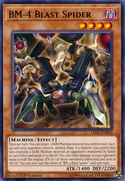 Once per turn: You can target 1 DARK Machine monster you control and 1 face-up card your opponent controls; destroy them. If a monster you control that was originally a DARK Machine destroys an opponent’s monster(s) by battle or card effect and sends it to the GY: You can inflict damage to your opponent equal to half the original ATK of 1 of those monster(s) destroyed and sent to the GY. You can only use this effect of ‘BM-4 Blast Spider’ once per turn.