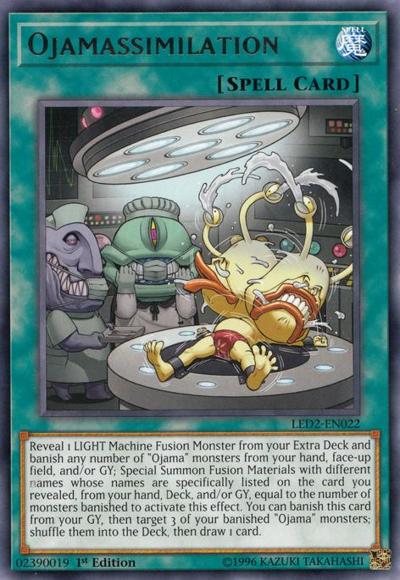 Reveal 1 LIGHT Machine Fusion Monster from your Extra Deck and banish any number of ‘Ojama’ monsters from your hand, face-up field, and/or GY; Special Summon Fusion Materials with different names whose names are specifically listed on the card you revealed, from your hand, Deck, and/or GY, equal to the number of monsters banished to activate this effect. You can banish this card from your GY, then target 3 of your banished ‘Ojama’ monsters; shuffle them into the Deck, then draw 1 card.