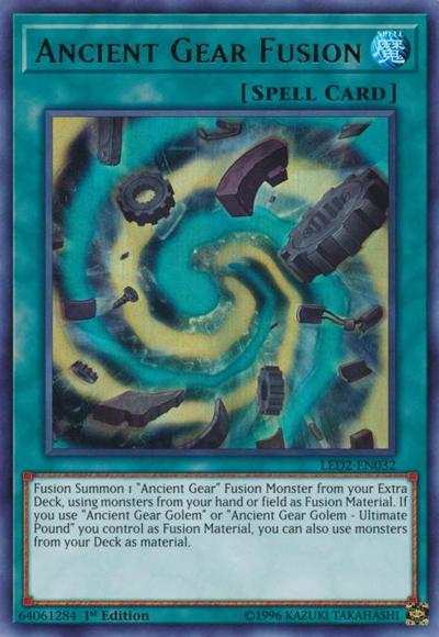 Fusion Summon 1 ‘Ancient Gear’ Fusion Monster from your Extra Deck, using monsters from your hand or field as Fusion Material. If you use ‘Ancient Gear Golem’ or ‘Ancient Gear Golem – Ultimate Pound’ you control as Fusion Material, you can also use monsters from your Deck as material.