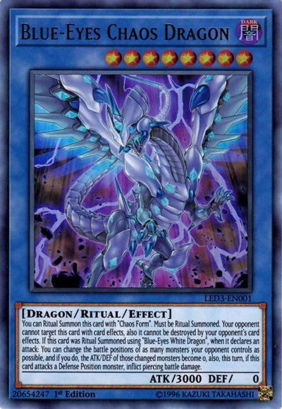 You can Ritual Summon this card with ‘Chaos Form’. Must be Ritual Summoned. Your opponent cannot target this card with card effects, also it cannot be destroyed by your opponent’s card effects. If this card was Ritual Summoned using ‘Blue-Eyes White Dragon’, when it declares an attack: You can change the battle positions of as many monsters your opponent controls as possible, and if you do, the ATK/DEF of those changed monsters become 0, also, this turn, if this card attacks a Defense Position monster, inflict piercing battle damage.
