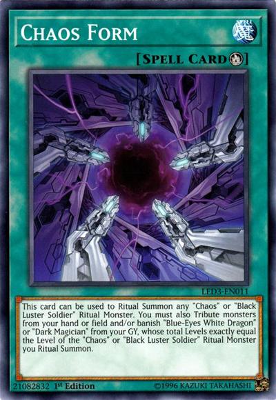 This card can be used to Ritual Summon any ‘Chaos’ or ‘Black Luster Soldier’ Ritual Monster. You must also Tribute monsters from your hand or field and/or banish ‘Blue-Eyes White Dragon’ or ‘Dark Magician’ from your GY, whose total Levels exactly equal the Level of the ‘Chaos’ or ‘Black Luster Soldier’ Ritual Monster you Ritual Summon.