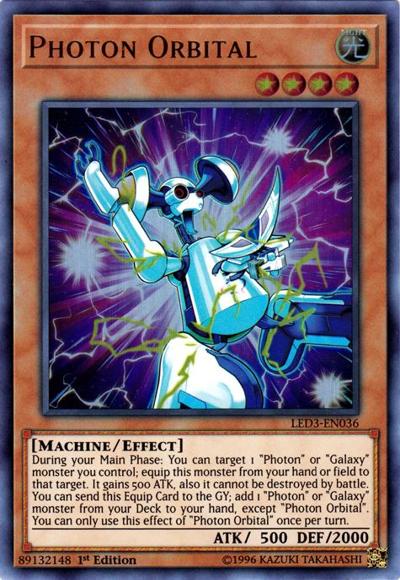 During your Main Phase: You can target 1 ‘Photon’ or ‘Galaxy’ monster you control; equip this monster from your hand or field to that target. It gains 500 ATK, also it cannot be destroyed by battle. You can send this Equip Card to the GY; add 1 ‘Photon’ or ‘Galaxy’ monster from your Deck to your hand, except ‘Photon Orbital’. You can only use this effect of ‘Photon Orbital’ once per turn.