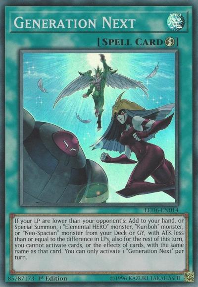 If your LP are lower than your opponent’s: Add to your hand, or Special Summon, 1 ‘Elemental HERO’ monster, ‘Kuriboh’ monster, or ‘Neo-Spacian’ monster from your Deck or GY, with ATK less than or equal to the difference in LPs, also for the rest of this turn, you cannot activate cards, or the effects of cards, with the same name as that card. You can only activate 1 ‘Generation Next’ per turn.