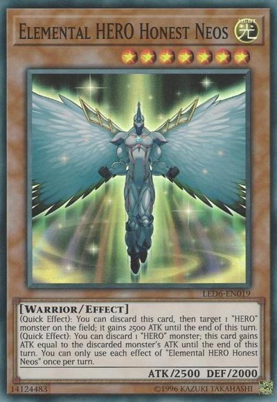 (Quick Effect): You can discard this card, then target 1 ‘HERO’ monster on the field; it gains 2500 ATK until the end of this turn. (Quick Effect): You can discard 1 ‘HERO’ monster; this card gains ATK equal to the discarded monster’s ATK until the end of this turn. You can only use each effect of ‘Elemental HERO Honest Neos’ once per turn.