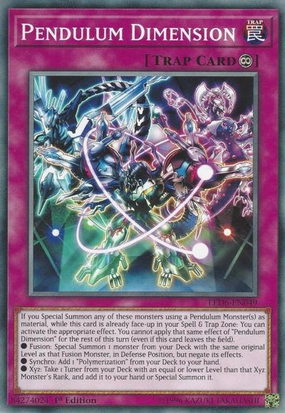 If you Special Summon any of these monsters using a Pendulum Monster(s) as material, while this card is already face-up in your Spell & Trap Zone: You can activate the appropriate effect. You cannot apply that same effect of ‘Pendulum Dimension’ for the rest of this turn (even if this card leaves the field).● Fusion: Special Summon 1 monster from your Deck with the same original Level as that Fusion Monster, in Defense Position, but negate its effects.● Synchro: Add 1 ‘Polymerization’ from your Deck to your hand.● Xyz: Take 1 Tuner from your Deck with an equal or lower Level than that Xyz Monster’s Rank, and add it to your hand or Special Summon it.
