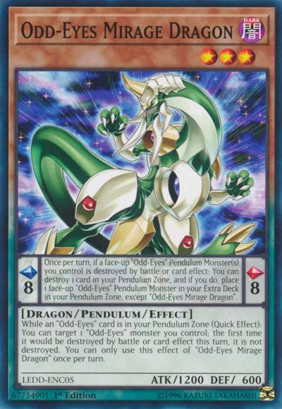 Pendulum EffectOnce per turn, if a face-up ‘Odd-Eyes’ Pendulum Monster(s) you control is destroyed by battle or card effect: You can destroy 1 card in your Pendulum Zone, and if you do, place 1 face-up ‘Odd-Eyes’ Pendulum Monster in your Extra Deck in your Pendulum Zone, except ‘Odd-Eyes Mirage Dragon’.Monster EffectWhile an ‘Odd-Eyes’ card is in your Pendulum Zone (Quick Effect): You can target 1 ‘Odd-Eyes’ monster you control; the first time it would be destroyed by battle or card effect this turn, it is not destroyed. You can only use this effect of ‘Odd-Eyes Mirage Dragon’ once per turn.