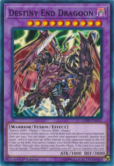 ‘Destiny HERO – Plasma’ + ‘Destiny HERO – Dogma’A Fusion Summon of this card can only be done with the above Fusion Materials. Once per turn: You can target 1 monster your opponent controls; destroy that target, and if it was face-up, inflict damage to your opponent equal to the ATK it had on the field. You cannot conduct your Battle Phase the turn you activate this effect. Once per turn, during your Standby Phase, if this card is in your GY: You can banish 1 ‘Destiny HERO’ card from your GY; Special Summon this card.