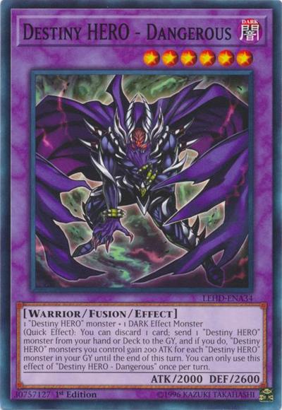 1 ‘Destiny HERO’ monster + 1 DARK Effect Monster(Quick Effect): You can discard 1 card; send 1 ‘Destiny HERO’ monster from your hand or Deck to the GY, and if you do, ‘Destiny HERO’ monsters you control gain 200 ATK for each ‘Destiny HERO’ monster in your GY until the end of this turn. You can only use this effect of ‘Destiny HERO – Dangerous’ once per turn.