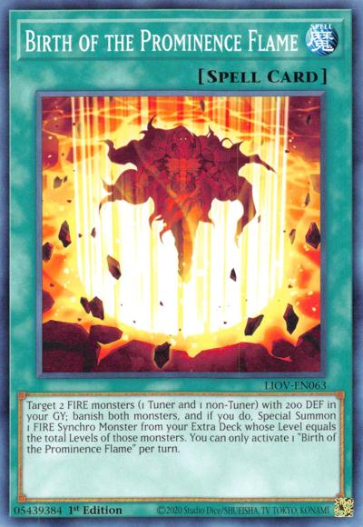Target 2 FIRE monsters (1 Tuner and 1 non-Tuner) with 200 DEF in your GY; banish both monsters, and if you do, Special Summon 1 FIRE Synchro Monster from your Extra Deck whose Level equals the total Levels of those monsters. You can only activate 1 ‘Birth of the Prominence Flame’ per turn.