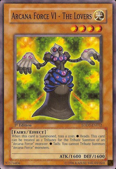 When this card is Summoned, toss a coin: ● Heads: This card can be treated as 2 Tributes for the Tribute Summon of an ‘Arcana Force’ monster. ● Tails: You cannot Tribute Summon ‘Arcana Force’ monsters.