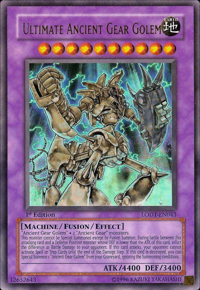 ‘Ancient Gear Golem’ + 2 ‘Ancient Gear’ monstersMust be Fusion Summoned. If this card attacks a Defense Position monster, inflict piercing battle damage. If this card attacks, your opponent cannot activate Spell/Trap Cards until the end of the Damage Step. If this card is destroyed: You can target 1 ‘Ancient Gear Golem’ in your GY; Special Summon it, ignoring its Summoning conditions.