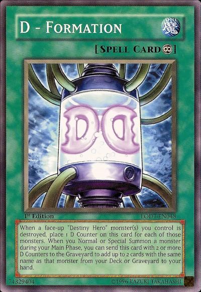 Each time a face-up ‘Destiny HERO’ monster(s) you control is destroyed, place 1 D Counter on this card for each of those monsters. When you Normal or Special Summon a monster during your Main Phase: You can send this card with 2 or more D Counters to the Graveyard; add up to 2 cards from your Deck and/or Graveyard to your hand, with the same name as that monster.