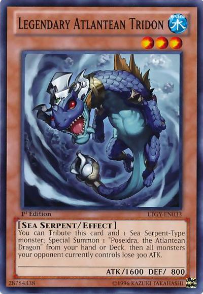 You can Tribute this card and 1 Sea Serpent-Type monster; Special Summon 1 ‘Poseidra, the Atlantean Dragon’ from your hand or Deck, then all monsters your opponent currently controls lose 300 ATK.