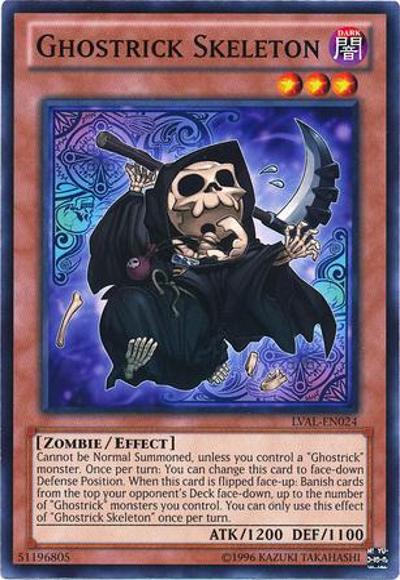 Cannot be Normal Summoned, unless you control a ‘Ghostrick’ monster. Once per turn: You can change this card to face-down Defense Position. When this card is flipped face-up: Banish cards from the top of your opponent’s Deck face-down, up to the number of ‘Ghostrick’ monsters you control. You can only use this effect of ‘Ghostrick Skeleton’ once per turn.