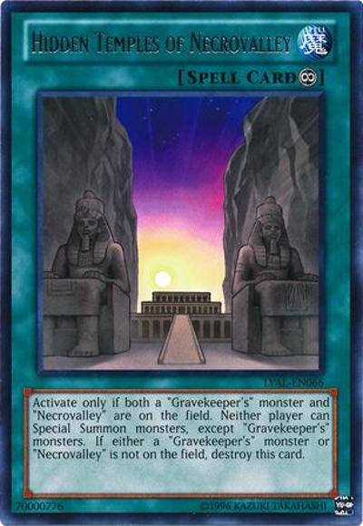 Activate only if both a ‘Gravekeeper’s’ monster and ‘Necrovalley’ are on the field. Neither player can Special Summon monsters, except ‘Gravekeeper’s’ monsters. If either a ‘Gravekeeper’s’ monster or ‘Necrovalley’ is not on the field, destroy this card.