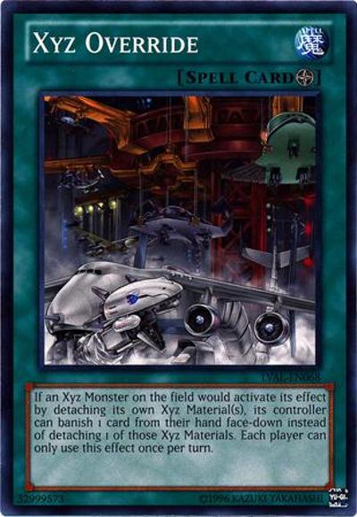 If an Xyz Monster on the field would activate its effect by detaching its own Xyz Material(s), its controller can banish 1 card from their hand face-down instead of detaching 1 of those Xyz Materials. Each player can only use this effect once per turn.