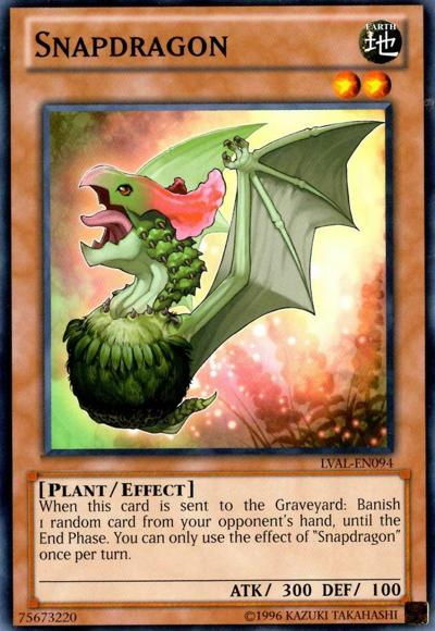 When this card is sent to the Graveyard: Banish 1 random card from your opponent’s hand, until the End Phase. You can only use the effect of ‘Snapdragon’ once per turn.
