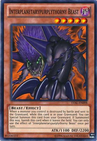 When a monster you control is destroyed by battle and sent to the Graveyard, while this card is in your Graveyard: You can Special Summon this card from your Graveyard. If Summoned this way, banish this card when it leaves the field. You can only use the effect of ‘Interplanetarypurplythorny Beast’ once per turn.
