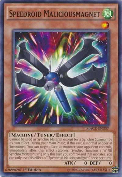 Cannot be used as Synchro Material except for a Synchro Summon by its own effect. During your Main Phase, if this card is Normal or Special Summoned: You can target 1 face-up monster your opponent controls; immediately after this effect resolves, Synchro Summon 1 WIND Synchro Monster using only this card you control and that monster. You can only use this effect of ‘Speedroid Maliciousmagnet’ once per turn.
