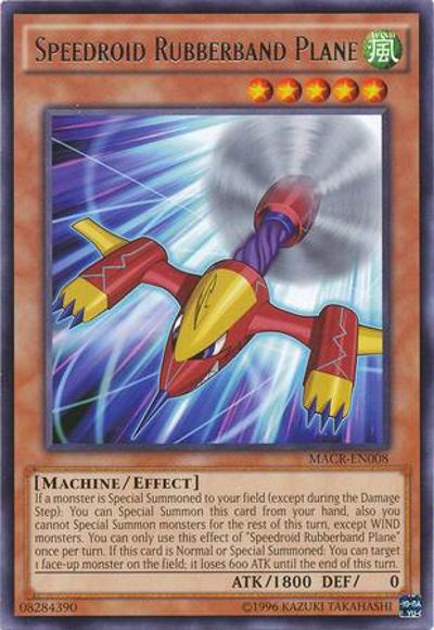 If a monster is Special Summoned to your field (except during the Damage Step): You can Special Summon this card from your hand, also you cannot Special Summon monsters for the rest of this turn, except WIND monsters. You can only use this effect of ‘Speedroid Rubberband Plane’ once per turn. If this card is Normal or Special Summoned: You can target 1 face-up monster on the field; it loses 600 ATK until the end of this turn.