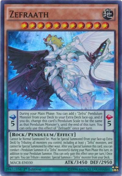 Pendulum EffectDuring your Main Phase: You can add 1 ‘Zefra’ Pendulum Monster from your Deck to your Extra Deck face-up, and if you do, change this card’s Pendulum Scale to be the same as that Pendulum Monster’s, until the end of this turn. You can only use this effect of ‘Zefraath’ once per turn.Monster EffectCannot be Normal Summoned/Set. Must be Special Summoned (from your face-up Extra Deck) by Tributing all monsters you control, including at least 3 ‘Zefra’ monsters, and cannot be Special Summoned by other ways. After you Special Summon this card, you can conduct 1 Pendulum Summon of a ‘Zefra’ monster(s) during your Main Phase this turn, in addition to your Pendulum Summon. (You can only gain this effect once per turn.) Once per turn: You can Tribute 1 monster; Special Summon 1 ‘Zefra’ monster from your Deck.