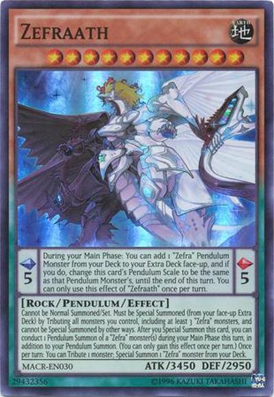 Pendulum EffectDuring your Main Phase: You can add 1 ‘Zefra’ Pendulum Monster from your Deck to your Extra Deck face-up, and if you do, change this card’s Pendulum Scale to be the same as that Pendulum Monster’s, until the end of this turn. You can only use this effect of ‘Zefraath’ once per turn.Monster EffectCannot be Normal Summoned/Set. Must be Special Summoned (from your face-up Extra Deck) by Tributing all monsters you control, including at least 3 ‘Zefra’ monsters, and cannot be Special Summoned by other ways. After you Special Summon this card, you can conduct 1 Pendulum Summon of a ‘Zefra’ monster(s) during your Main Phase this turn, in addition to your Pendulum Summon. (You can only gain this effect once per turn.) Once per turn: You can Tribute 1 monster; Special Summon 1 ‘Zefra’ monster from your Deck.