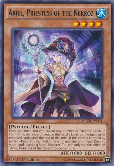Once per turn: You can reveal any number of ‘Nekroz’ cards in your hand; increase or reduce this card’s Level by the number of revealed cards until the end of this turn. If this card is Tributed by a card effect: You can add 1 ‘Nekroz’ monster from your Deck to your hand, except a Ritual Monster. You can only use this effect of ‘Ariel, Priestess of the Nekroz’ once per turn.