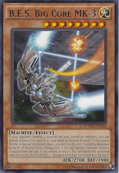 If your opponent controls a monster and you control no monsters, you can Special Summon this card (from your hand) in Defense Position. If this card is Normal or Special Summoned: Place 3 counters on this card. Cannot be destroyed by battle. At the end of the Damage Step, if this card battled: Remove 1 counter from this card. If you cannot, destroy it. You can banish this card from your Graveyard; shuffle all ‘B.E.S.’ monsters from your Graveyard into the Deck.