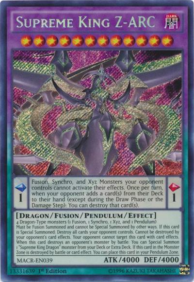 Pendulum EffectFusion, Synchro, and Xyz Monsters your opponent controls cannot activate their effects. Once per turn, when a card(s) is added from the Main Deck to your opponent’s hand (except during the Draw Phase or the Damage Step): You can destroy that card(s).Monster Effect4 Dragon monsters (1 Fusion, 1 Synchro, 1 Xyz, and 1 Pendulum)Must be Fusion Summoned. If this card is Special Summoned: Destroy all cards your opponent controls. Cannot be destroyed by your opponent’s card effects. Your opponent cannot target this card with card effects. When this card destroys an opponent’s monster by battle: You can Special Summon 1 ‘Supreme King Dragon’ monster from your Deck or Extra Deck. If this card in the Monster Zone is destroyed by battle or card effect: You can place this card in your Pendulum Zone.