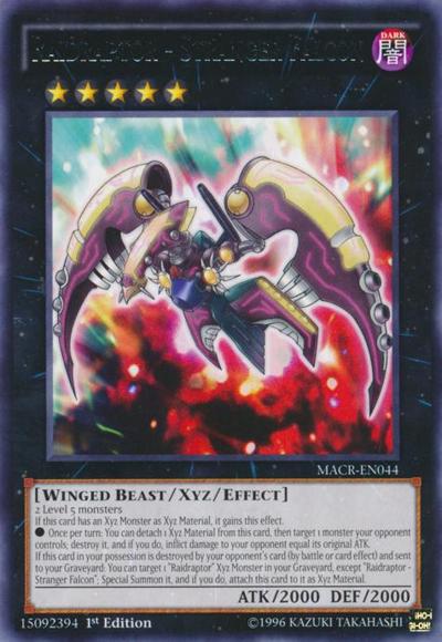 2 Level 5 monstersIf this card has an Xyz Monster as Xyz Material, it gains this effect.● Once per turn: You can detach 1 Xyz Material from this card, then target 1 monster your opponent controls; destroy it, and if you do, inflict damage to your opponent equal its original ATK.If this card in your possession is destroyed by your opponent’s card (by battle or card effect) and sent to your Graveyard: You can target 1 ‘Raidraptor’ Xyz Monster in your Graveyard, except ‘Raidraptor – Stranger Falcon’; Special Summon it, and if you do, attach this card to it as Xyz Material.