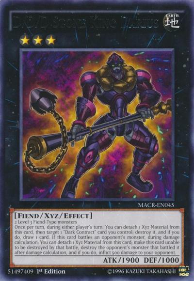 2 Level 3 Fiend-Type monstersOnce per turn, during either player’s turn: You can detach 1 Xyz Material from this card, then target 1 ‘Dark Contract’ card you control; destroy it, and if you do, draw 1 card. If this card battles an opponent’s monster, during damage calculation: You can detach 1 Xyz Material from this card; make this card unable to be destroyed by that battle, destroy the opponent’s monster that battled it after damage calculation, and if you do, inflict 500 damage to your opponent.