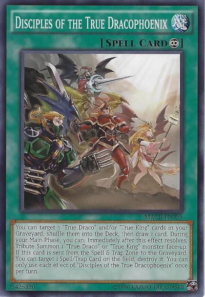 You can target 3 ‘True Draco’ and/or ‘True King’ cards in your GY; shuffle them into the Deck, then draw 1 card. During your Main Phase, you can: Immediately after this effect resolves, Tribute Summon 1 ‘True Draco’ or ‘True King’ monster face-up. If this card is sent from the Spell & Trap Zone to the GY: You can target 1 Spell/Trap on the field; destroy it. You can only use each effect of ‘Disciples of the True Dracophoenix’ once per turn.