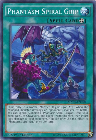 Equip only to a Normal Monster. It gains 500 ATK. When the equipped monster destroys an opponent’s monster by battle: You can Special Summon 1 ‘Phantasm Spiral Dragon’ from your hand, Deck, or Graveyard, and equip it with this card, then inflict 1000 damage to your opponent. You can only use this effect of ‘Phantasm Spiral Grip’ once per turn.