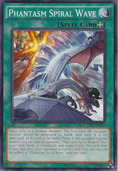 Equip only to a Normal Monster. The first time the equipped monster would be destroyed by battle each turn, it is not destroyed. At the end of the Battle Phase, if the equipped monster battled: You can Special Summon 1 ‘Phantasm Spiral Dragon’ from your hand, Deck, or Graveyard, and equip it with this card, then if they have any, your opponent discards 1 card. You can only use this effect of ‘Phantasm Spiral Wave’ once per turn.