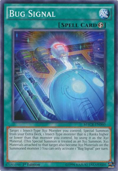 Target 1 Insect Xyz Monster you control; Special Summon from your Extra Deck, 1 Insect monster that is 2 Ranks higher or lower than that monster you control, by using it as the Xyz Material. (This Special Summon is treated as an Xyz Summon. Xyz Materials attached to that target also become Xyz Materials on the Summoned monster.) You can only activate 1 ‘Bug Signal’ per turn.