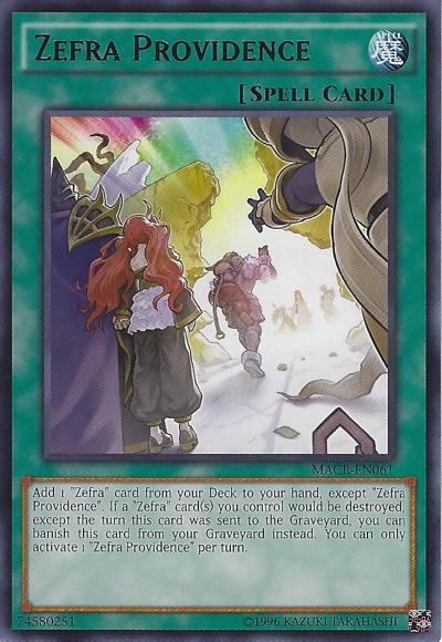 Add 1 ‘Zefra’ card from your Deck to your hand, except ‘Zefra Providence’. If a ‘Zefra’ card(s) you control would be destroyed, except the turn this card was sent to the Graveyard, you can banish this card from your Graveyard instead. You can only activate 1 ‘Zefra Providence’ per turn.