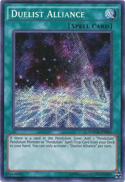 If there is a card in the Pendulum Zone: Add 1 ‘Pendulum’ Pendulum Monster or ‘Pendulum’ Spell/Trap from your Deck to your hand. You can only activate 1 ‘Duelist Alliance’ per turn.