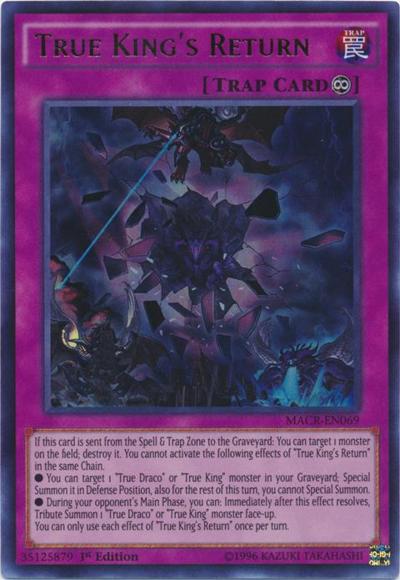 If this card is sent from the Spell & Trap Zone to the GY: You can target 1 monster on the field; destroy it. You cannot activate the following effects of ‘True King’s Return’ in the same Chain.● You can target 1 ‘True Draco’ or ‘True King’ monster in your GY; Special Summon it in Defense Position, also for the rest of this turn, you cannot Special Summon.● During your opponent’s Main Phase, you can: Immediately after this effect resolves, Tribute Summon 1 ‘True Draco’ or ‘True King’ monster face-up.You can only use each effect of ‘True King’s Return’ once per turn.